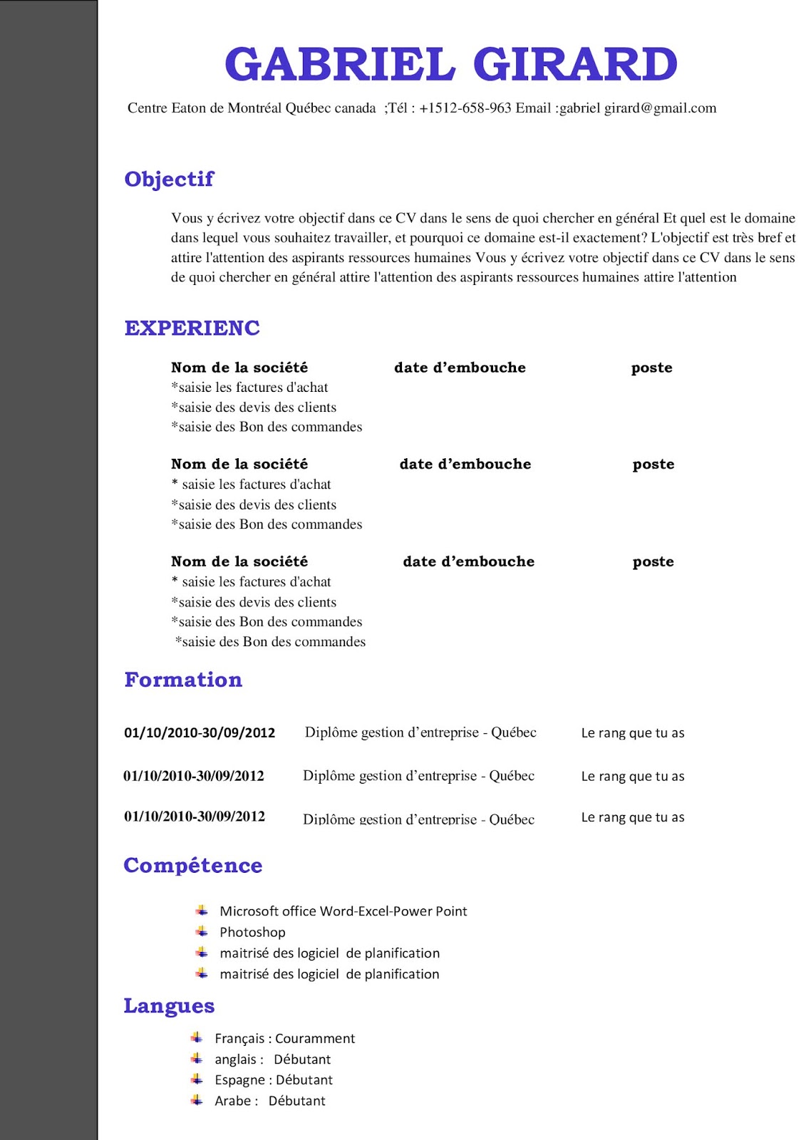 Trending Exemple De Cv Canadien En Francais * dans le champ objectif no racontez pas l'histoire de votre vie; Exemple De Cv Canadien En Francais - Remplissez vos coordonnees, choisissez un modele et telechargez votre cv.